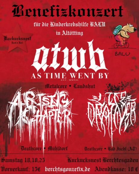 Am 18.Oktober wird’s LAUT Im Kuckucksnest, und das für einen guten Zweck!! Zugunsten der Kinderkrebshilfe BALU aus Altötting haben A Rising Chapter und die Kuckucks-Crew ein Benefizkonzert auf die Beine gestellt 🫶 Alle Einnahmen gehen direkt an BALU, um krebskranke Kinder und ihre Familien zu unterstützen — also schaut vorbei, haut